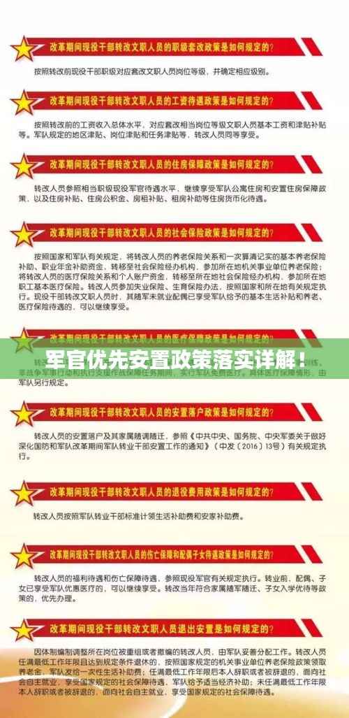 军官优先安置政策的落实是国家对军人贡献的认可与回馈,也是稳定军队人才、提高军队士气的重要举措,为确保政策的顺利实施,我们需要制定明确的安置政策、加强组织协调、加大财政投入、建立信息共享机制等,还要面临挑战并制定解决方案,只有这样,我们才能真正实现军官优先安置的目标,为国防建设提供有力保障。